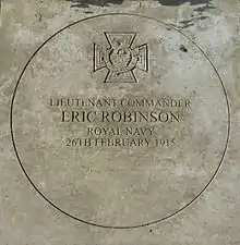 On 26 February 2015, one hundred years after his VC-winning deed, a commemorative paving stone was laid outside Robinson's former home at 1 Diamond Terrace, Greenwich.[20] At the event Commander Operations, Rear Admiral Matthew Parr said he was in awe of Lt Cdr Robinson’s "selfless actions" and added: "His courage, determination and fortitude in the face of overwhelming enemy action remain an example to us all; this commemorative stone will serve as a permanent memorial to a remarkable man."[21]
