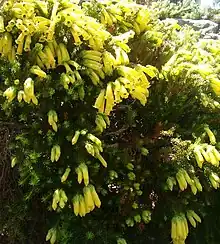 Erica nana is a typical Cape heath, with small, fine needle-like leaves, a shrubby growth habit, and waxy yellow tubular flowers. It grows to about 1 metre (3+12 feet) in diameter and half that in height.[1]