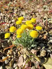 Erigeron aphanactis grows in sage, scrub, and open woodland habitat. It is a short, clumping perennial with stem and foliage covered in stiff hairs and resin glands. Most of the narrow, fuzzy leaves are near the base of the plant. The erect stems hold inflorescences of one or more flat, buttonlike flower heads, which contain numerous golden yellow disc florets but no ray florets. Each head is about 10 mm (0.4 inches) wide.[5]