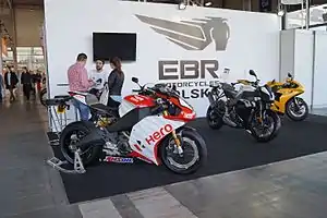 Erik Buell Racing (EBR) is an American motorcycle sport company which produces street and racing motorcycles, based in East Troy, Wisconsin, USA. The business entered receivership in April 2015.[1] After two previous attempts, the business remnants were sold in January 2016 to Liquid Asset Partners (LAP), an American organization specializing in the purchase and liquidation of failed businesses.[2][3] Liquid Asset Partners kept the company intact and motorcycle production resumed on March 1, 2016, the first new model rolling out on March 17, 2016.