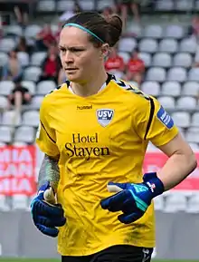 Following the 2015 NWSL season, McLeod was released by the Dash in order to pursue a chance to play in the UEFA Women's Champions League. It was announced in February 2016 that she had signed with Swedish team, FC Rosengård, along with her wife, Ella Masar.[51] McLeod made her debut for the team in the 2016 Super Cup on March 16, where FC Rosengård won 2–1. Though she was noticeably nervous, she made a number of saves and showed good reflexes.[52] On March 23, 2016, McLeod played 13 minutes of a preseason friendly before being forced off due to a knee injury.[53][54] It was later revealed that McLeod had suffered a third right ACL injury, although the injury had most likely occurred a month earlier while playing with the Canadian national team.[55][56] The injury caused her to miss the entire 2016 season, returning to make her Damallsvenskan debut in a 5–0 win over Göteborg on May 7, 2017.[57] Rosengård chose not to renew McLeod's contract at the end of 2017.[58]