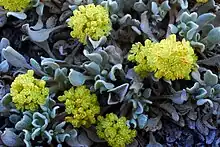 Eriogonum diclinum is a species of wild buckwheat known by the common name Jaynes Canyon buckwheat. It is native to the Klamath Mountains of northern California and southern Oregon, where it is an uncommon member of plant communities on serpentine soils. This is a small dioecious shrub forming low, thick mats rarely exceeding 20 centimeters in height. The curving, oval-shaped leaves are woolly and greenish gray in color, growing up to two centimeters long. The plant flowers in yellow to reddish rounded inflorescences, male plants producing clusters of staminate flowers, and female plants producing larger clusters of pistillate flowers.