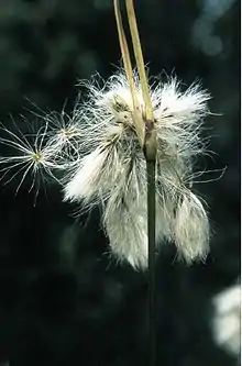 This perennial sedge forms tufts of stiff, erect stems, sometimes just a single stem, and basal leaves up to 30 centimeters long. It grows from a rhizome. The inflorescence is accompanied by two to four leaflike bracts each a few centimeters long. There are up to 30 spikelets, increasing in size as the fruit develops, reaching 3 centimeters in length. Each flower has a tuft of white or brown bristles that are long and cottony, measuring up to 2.5 centimeters long.[1][3]