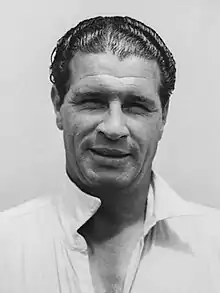 Toshack's performance in the First Test at Trent Bridge was a quiet one, taking a wicket in each innings.[13] He was involved in an aggressive final wicket partnership of 32 with Johnston, scoring 19 runs, his best at Test level to date in just 18 minutes.[33] Toshack's best Test performance was his 5/40 in the second innings of the Second Test at Lord's when Miller was unable to bowl after being injured,[12] including the wickets of Cyril Washbrook, Bill Edrich, captain Yardley and Alec Coxon.[8] During this performance, he employed two short legs and a silly mid-off.[29] He had a moderately successful Third Test, taking figures of 3/101 in the only Test that Australia did not win. His knee injury flared again in the Fourth Test after taking an ineffective 1/112 in the first innings, he was unable to bowl in the second innings of an Australian win.[6] He made a recovery and it was hoped that he would be able to play in the Fifth Test, but he injured again himself in the lead-up match against Lancashire.[4] He was taken to London for cartilage surgery, ending his tour and his Test career.[13] An inept batsman with an average of 5.78 in first-class fixtures, Toshack managed a Test average of 51 on the 1948 tour after being out only once, behind only Arthur Morris, Sid Barnes, Bradman and Neil Harvey. The unbeaten 20 he managed in the Lord's Test was his best first-class score, made in an uninhibited tenth-wicket stand with Johnston.[5][12] Due to the fragility of his knee, Toshack was used sparingly in the tour games, playing in only 11 of the 29 non-Test matches on the tour.[6][34] Toshack totalled 50 wickets at the average of 21.12 for the tour.[6]