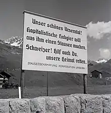 Incidental to his imagery of traditional lifestyles, and as evidence of his own conservationist values, was his deliberate recording of the conflicting reactions to hydroelectric schemes in Switzerland which were to bring cheap electricity, but with the consequence of flooding of pastures and relocation of historic villages and their populations, as well as the industrialisation rural areas.[3]