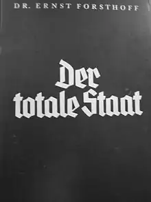 In the 1930s, Forsthoff was among the jurists such as Carl Schmitt, Karl Larenz, Theodor Maunz and Herbert Krüger who endeavoured to legitimise the Nazi regime through their writings. Forsthoff's 1933 paper Der totale Staat (The Total State) advocated a broad understanding of the Führerprinzip as an exclusive and unlimited power of command over all subjects of the state. He himself was unwilling to submit fully to the Nazi state, however, and fell in disfavour with the authorities during the war. In a seminal 1938 paper, he coined the term Daseinsvorsorge, introducing the concept of public services to German legal thinking.