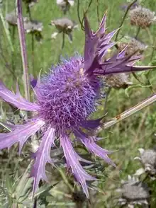 Eryngium leavenworthii, also known as Leavenworth's eryngo, is an annual plant in the family Apiaceae that is native to the central United States. It can reach heights up to 3 feet. It inhabits dry rocky prairies, roadside fields, open woodlands and waste areas. The plant is mostly found in areas with limestone or chalk soils. Its flowers appear between July and September, although in some areas the flowers may bloom as late as November. The flower ranges in length from 1 1/2" to 3" and in width approximately 1/2". It is frequently mistaken for thistle. The flowers sit atop elongated stems on spiked leaves and form cones of purple or wine colored, tightly clustered blossoms that resemble small fuzzy pineapples. It was named after, Melines Conklin Leavenworth (1796–1862) who is credited with its discovery.