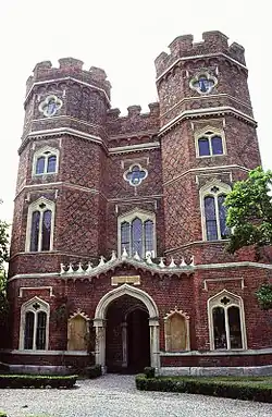 Waynflete's Tower (51°22′26″N 0°22′36″W / 51.3738°N 0.3768°W) is a Grade I listed[6] gatehouse, originally built at the same time as the late 15th-century house, but much modified by William Kent following Henry Pelham's purchase of the property. Kent designed the additions of the two three-bay ranges of three stories to each side and the one-story porch between the turrets with ogee-arched doorway, triple window above with ogee-headed lights (window spaces), and quatrefoil windows. The rib-vaulted entrance hall was the gateway in Wayneflete's time which Kent had stuccoed or plastered over.[2] The Tower is currently a residence.[7]