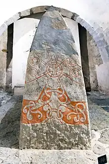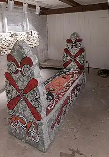 Eskilstunakista ("Eskiltuna coffin") is a Swedish term for early Christian grave monuments found in Sweden, influenced by the Anglo-Saxon tradition where venerated persons were buried in a specially designed stone coffin. Eskilstuna coffins were on the other hand never intended for the remains of the deceased, but was constructed on top of the burial site.[1] The coffins consist of five ornamental stone slabs; two side slabs, two gable slabs, and a lid slab. The name originates from the first complete coffin found in Eskilstuna; later other fragments and slabs of the same kind have been identifiers as Eskilstuna coffins.