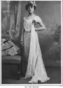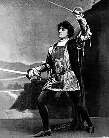 Esme Beringer first appeared on stage in 1888, as a boy character, Dick Tipton, in Little Lord Fauntleroy (she also substituted for the title character, usually played by her sister). By 1893 she was very active on the London stage. Beringer's athletic physique and extensive training with swords made her well-suited to breeches roles,[6] as when she played Romeo in 1896[7] (opposite her sister Vera as Juliet).[8][9] Other stage appearances by Beringer included The Prince and the Pauper (1890), Foreign Policy (1893, by Arthur Conan Doyle), Bud and Blossom (1893, by Gertrude Elizabeth Blood), Three Wayfarers (1893, by Thomas Hardy), Bess (1893), Hypatia (1893), The Gentleman Whip, The New Boy, Loyal, Hal the Highwayman, The Lady's Idol, The Strange Adventures of Miss Brown, The Benefit of the Doubt, The Late Mr. Castello, Gossip (1896), A Mother of Three, Woman's World, The Pilgrim's Progress, The Last of his Race, The Winter's Tale,[10] Saviolo (1899, by Egerton Castle), The Trifler (1905), The Anarchist (1908),[11] The Blue Stockings (1913),[12] and Lucky Jim (1916).[13][14][15] She also performed in vaudeville, in The Point of the Sword.[3]