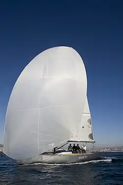 The traditional spinnaker is replaced with a gennaker that is set on an extensible bowsprit. Using a bowsprit allows the size of the gennaker to be a much larger sail than would be possible with a symmetrical spinnaker. The speeds achieved downwind by these designs can be remarkable. In the case of the Esse 990, speeds of 17 knots(19.5 mph/31.4 km/h) are readily achievable in true wind velocities greater than 25 knots (46 km/h) .
