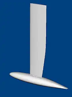 The weight of the entire boat is 2100 kilograms, including the hull and standing rigging. The design concentrates the righting moment of the keel in a 990 kilogram torpedo-shaped bulb at the end of an airfoil shaped fin. The ballast to displacement ratio is 0.47 which provides a "stiff" and stable platform. The high righting moment allows the design to carry a larger than normal sail area which increases power and consequently speed through the water.