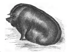 Like other old British pig breeds, the ancestor of the Essex may have originated in the county of the same name from selective breeding of local wild pigs. It was originally a smallish, "coarse" black-and-white pig that was noted for being easy to keep and cheap to feed, qualities that ensured its popularity with smallholders. The Old Essex, as it came to be known, was deliberately "improved" in the mid 19th century by crossing it with imported pigs.[1] In the early nineteenth century, while travelling in Italy, Charles Western, 1st Baron Western obtained Neapolitan pigs to cross with his Essex sows. One of his tenants, Fisher Hobbs, bred the resulting Neapolitan-Essex boars with his "coarse" Essex sows and established the Improved Essex. In 1840 an Improved Essex boar and sow, both bred by Hobbs, each took first prize in its class at the second show of the Royal Agricultural Society at Cambridge.[2]
