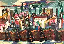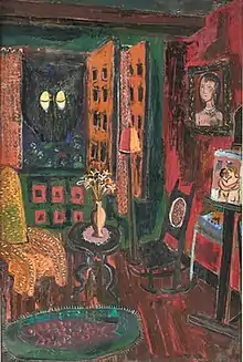 In 1943, Rolick participated in an annual competition held by the A.C.A Gallery in New York to select an artist for a solo exhibition during the following year. When the gallery's jury was unable to select a winner, she and six other finalists were named to an honorable-mention group for a small-group show instead.[8] In January 1947, she was given a solo exhibition of drawings at the Jacques Seligmann Galleries in New York and a few months later her paintings appeared in a group show at the Los Angeles County Museum of Art.[9][note 1] When the Seligmann Galleries gave her a solo exhibition of paintings in January 1948, a critic for the New York Times noted in them a "directness and fervor" and said they showed considerable improvement on the works she had previously shown.[11] When that exhibition closed in New York, Seligmann toured it around the country. When it appeared in Louisville, Kentucky, a critic for the Louisville Courier-Journal said Rolick had been remarkably successful for a 24-year-old artist, having made sales to collectors, including the art historian Wilhelm Valentiner.[4] Later in 1948, Seligmann included Rolick's paintings in a group of six. At that time a Times critic called her paintings "technically sure and sophisticated".[12]