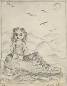 An untitled painting of animals and human figured from 1941, shown at right, shows her handling of color and treatment of fantastic subjects in oil. A drawing from 1942, "Self-Portrait in Shoe", shown at left, indicates a light-hearted use of fantasy early in her career. An oil of 1948-1949 called "Nuns and Priest Pass by Ruins, Florence", shown at right, indicates her mid-career handling of color and fantasy in an urban setting. At left, another oil, "Night Is a Black Cat", of 1951, shows her ability to paint in a decorative style while still maintaining what a critic called "sinister" overtones.[11]