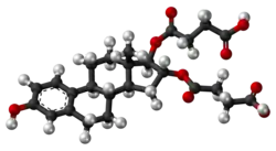 Estriol succinate is an estrogen ester, specifically, an ester of estriol, and acts as a prodrug of estriol in the body.[7][1] It is described as a weak estrogen in comparison to estradiol valerate.[1][8] Estriol succinate is used medically via oral and vaginal routes similarly.[1] In estriol succinate, two of the hydroxyl groups of estriol, those at the C16α and C17β positions, are esterified with succinic acid.[1] As such, when adjusted for differences in molecular weight, a dose of 2 mg estriol succinate is equivalent to 1.18 mg unconjugated estriol.[1] Unlike other estrogen esters, such as estradiol valerate, estriol succinate is hydrolyzed almost not at all in the intestinal mucosa when taken orally, and in relation to this, is absorbed more slowly than is estriol.[1] Consequently, oral estriol succinate is a longer-acting form of estriol than oral estriol.[9] Instead of in the gastrointestinal tract, oral estriol succinate is cleaved into estriol mainly in the liver.[1] After a single 8 mg oral dose of estriol succinate, maximum levels of circulating estriol of 40 pg/mL are attained within 12 hours, and this increases up to 80 pg/mL with continued daily administration.[1]