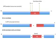 Amyloid plaques formed by amyloid-β (Aβ) deposition and neurofibrillary tangles formed by tau protein phosphorylation are dominant physiological features of Alzheimer's disease. Amyloid precursor protein (APP) proteolysis is fundamental for production of Aβ peptides implicated in AD pathology.[6] By using a cell line that contains high levels of estrogen receptors, scientists found that treatment with physiological concentrations of 17 beta-estradiol is associated with accumulation in the conditioned medium of an amino-terminal cleavage product of APP (soluble APP or protease nexin-2), indicative of non-amyloidogenic processing.[7]