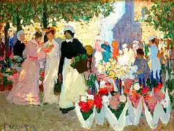 In her lifetime, Carrick's reputation was eclipsed by her husband's, in part because she spent a good deal of her time promoting his career rather than her own, lobbying Australian collectors and curators to buy his work and arranging exhibitions both while he was alive and posthumously.[2][3] In recent years, her reputation has been rising, and critics today consider her work more adventurous than that of her husband.[3][6] In 1996, one of her paintings set an auction record of A$105,500 for works by an Australian woman artist,[6] and the following year saw the publication of a biography, Ethel Carrick Fox: Travels and Triumphs of a Post-Impressionist by art historian Susanna de Vries.[7] Her Market Under Trees, sold by Sotheby's in 1999 for A$266,500, was bought at auction for just over A$1 million in 2008.[8]