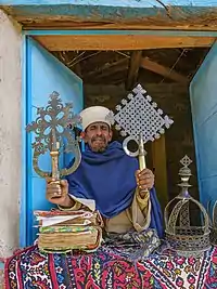 An Ethiopian Orthodox priest with traditional Axumite crosses