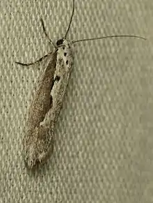 The length of the forewings is 8.4–11.7 mm (0.33–0.46 in). The ground color of the forewings is divided by longitudinal line and is dark gray on the costal half and whitish gray on the dorsal half. There are several black spots. The ground color of the hindwings is pale to dark gray. Adults are on wing from February to October.[2] There are multiple generations per year. Adults rest by day along the midrib of the a leaf of their host plant, resembling a bird dropping.[3]
