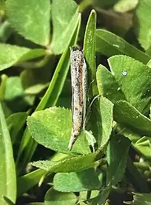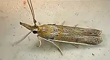 The adult lucerne seed web moth are long and slender when at rest. They have a protruding beak and are brown or grey, with a brown pattern on the forewing and a transverse orange stripe near the base. The forewings also have a white line along the leading edge or costa. The hind wings have brown veins running through satin beige/white with a dark brown outer edge. The males have knobs at the base of the antennae.[3] The wingspan is about 10 mm.[5]