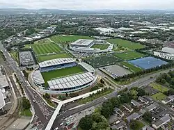 Etihad Campus is an area of Sportcity, Manchester which is mostly owned and operated by Manchester City Football Club. The campus includes the Etihad Stadium, the City Football Academy (CFA) training facility and club world headquarters,[1] and undeveloped land adjacent to both of these facilities. These two main portions of the campus site are linked by a 60-metre landmark pedestrian walkway/footbridge that spans the junction of Alan Turing Way and Ashton New Road. The term Etihad Campus embraces both the stadium – which already existed when the name was coined in 2010 – as well as much of the surrounding undeveloped land that existed at that time, although the term is also frequently used as a direct synonym for just the CFA portion.[2]