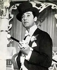 In 1903, Petrolini began performing in Rome at variety theaters and café-chantants, where he provided parodies of renowned nineteenth-century actors, silent movie and opera divas, rhetorical addresses, and even of the variety theater itself.[6] In the same year, when aged 19, he met Ines Colapietro, who became both his professional and personal companion for many years, as well as the mother of his two children.[7] Ines, who was at the time only 15 years old, was hired as a singer by the Gambrinus theater in Rome, along with her sister Tina.[7] Ettore and Ines formed the comic duo Loris-Petrolini, performing together until the summer of 1911.[8] In May 1907 in Genoa, Ettore and Ines were invited by the impresario Charles Séguin to tour South America.[9] They performed in theaters and cafes in Argentina, Uruguay and Brazil, enjoying great success everywhere and becoming a household name in the capitals.[9][10] While Petrolini was in Rio de Janeiro, appendicitis forced him to leave the stage for a month. After an emergency operation and a period of convalescence, his comeback was triumphant, with many theatrical artists giving up their pay in his favor. In a single evening, Petrolini once earned four thousand lire.[9] After Rio, Petrolini remained a few months longer in South America. He returned for other tours in 1909 and 1911-1912, also appearing in Mexico and Cuba.[10]