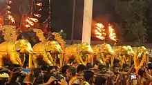 The famous Ettumanoor Mahadevar Temple hosts the arattu festival celebrated on a grand scale on the Thiruvathira day in February–March every year. Lot of people come to this temple on the 8th and 10th day of the festival when seven and half elephants (in Malayalam: ezharaponnaana) made of gold (nearly 13 kg) will be held in public view.this statue was donated to the temple by a travancore maharaja. The temple, the wealthiest Devaswom in Kerala, has many valuable possessions.