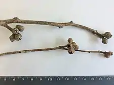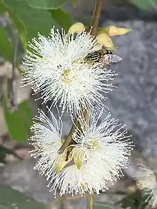 The flowers are arranged in groups of seven to fifteen or more, the groups on a flattened or angular peduncle 7–15 mm (0.3–0.6 in) long, the individual flowers sometimes on a pedicel up to 8 mm (0.3 in) long, or sessile. The buds are cone-shaped, the floral cup hemispherical 2–3 mm (0.08–0.1 in) long, the operculum conical, 7–9 mm (0.3–0.4 in) long and about 4 mm (0.2 in) wide at the join. Flowering occurs between November and January and the fruit is a woody, hemispherical capsule 2–5 mm (0.08–0.2 in) long and 4–6 mm (0.16–0.24 in) wide on a pedicel 1–5 mm (0.04–0.2 in) long. There are three or four upward-pointing valves on the top of the fruit.[3][4][5]