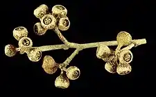 The dull or glossy, green, concolorous adult leaves are alternately arranged. The leaf blade has a lanceolate to falcate shape and is 5 to 14 centimetres (2.0 to 5.5 in) in length and 0.9 to 3 cm (0.4 to 1.2 in) wide. It blooms around October and has produces axillary unbranched inflorescences which often are situated near ends of branches in clusters. The mature green to yellow buds have an ovoid to fusiform shape with a length of 5 to 6 mm (0.197 to 0.236 in) and a width of 3 mm (0.118 in) with white flowers. After flowering pedicellate fruits form with a hemispherical or barrel-shape. Each fruit has a length of 3 to 6 mm (0.118 to 0.236 in) and 3 to 7 mm (0.118 to 0.276 in) wide with a descending disc and three to four valves near rim level. The brown coloured seeds within have a pyramidal shape and a length of 1 to 2.5 mm (0.039 to 0.098 in).[4]