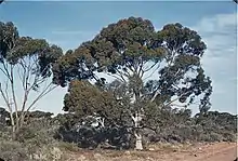Eucalyptus brockwayi, commonly known as Dundas mahogany,[3] is a tree that is endemic to Western Australia. It has smooth, shiny bark on the trunk and branches, glossy green, linear to narrow lance-shaped adult leaves, flower buds arranged in groups of between eleven and fifteen, white flowers and spherical fruit with a narrow neck.