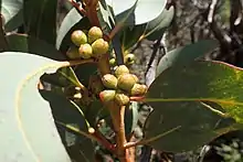 Subspecies conglobata has fruit that are 7–11 mm (0.28–0.43 in) in diameter whereas subspecies perata has narrower leaves, smaller buds and fruit 5–7 mm (0.20–0.28 in) in diameter.[3]