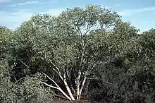Eucalyptus drummondii is a mallee that typically grows to a height of 3–4 m (9.8–13.1 ft) or sometimes a tree to 8 m (26 ft) and forms a lignotuber. It has smooth, powdery bark that is white, pink or grey in colour. Young plants and coppice regrowth have leaves arranged alternately, egg-shaped to more or less round, 55–80 mm (2.2–3.1 in) long and 18–55 mm (0.71–2.17 in) wide. Adult leaves are grey-green in colour, narrow elliptical to egg-shaped, 32–80 mm (1.3–3.1 in) long and 8–27 mm (0.31–1.06 in) wide on a petiole 7–22 mm (0.28–0.87 in) long. The flower buds are arranged in groups of seven in leaf axils on an unbranched peduncle 7–30 mm (0.28–1.18 in) long, the individual buds on a pedicel 2–12 mm (0.079–0.472 in) long. Mature buds are oval, 8–18 mm (0.31–0.71 in) long and 4–10 mm (0.16–0.39 in) wide with a conical to rounded operculum with a small point on the top. Flowering mainly occurs from September to December and the flowers are white. The fruit is a woody, hemispherical capsule 5–9 mm (0.20–0.35 in) long and 8–12 mm (0.31–0.47 in) wide with the valves extending beyond the level of the rim.[2][3][4][5]