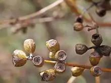 The flower buds are arranged in groups of three on a peduncle 5–10 mm (0.20–0.39 in) long, the individual buds on pedicels 1–3 mm (0.039–0.118 in) long. Mature buds are club-shaped to pear-shaped, 4–7 mm (0.16–0.28 in) long and 3–4 mm (0.12–0.16 in) wide with a rounded operculum. Flowering occurs in most months, depending on habitat and in some places follows rain. The flowers are whitish and the fruit is a woody conical, cylindrical, bell-shaped or barrel-shaped capsule four-sided in cross-section, 5–14 mm (0.20–0.55 in) long and 5–8 mm (0.20–0.31 in) wide.[2][3][4][5][6][7][8]