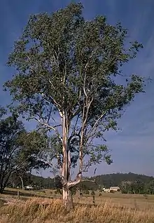 Eucalyptus glaucina, commonly known as the slaty red gum,[2] is a species of small to medium-sized tree endemic to New South Wales. It has smooth, white and grey bark, lance-shaped adult leaves, flower buds in groups of seven, white flowers and hemispherical fruit with the valves protruding well above the level of the rim.