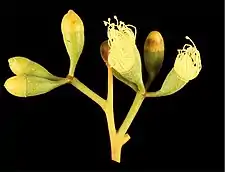 Eucalyptus jucunda, commonly known as Yuna mallee,[2] is a species of mallee or small tree that is endemic to Western Australia. It has smooth bark, lance-shaped to curved adult leaves, flowering buds in groups of seven or nine, white or cream-coloured flowers and barrel-shaped or shortened spherical fruit with an unusually narrow opening.