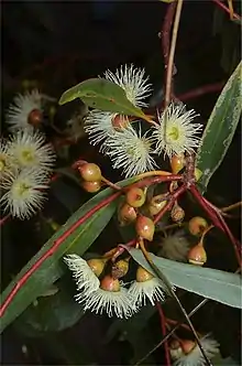 - Eucalyptus leucoxylon subsp. pruinosa (F.Muell. ex Miq.) Boland[19] has surface wax present on the juvenile leaves, flower buds and fruit, and has white flowers.[20]