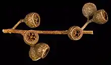 Subspecies megalocarpa is a relatively small tree with red flowers and large fruit is often available under the horticultural name, ‘Rosea’. It flowers profusely in winter, and is widely planted as an ornamental plant.[23][24] 'Euky Dwarf' is grown as a street and garden tree, growing to a height of 5–6 m (16–20 ft) tall and 3–4 m (9.8–13.1 ft) wide.[25] Subspecies leucoxylon has been recommended for larger gardens and parklands.[26] A variety known as Euky Dwarf is very popular as a street and garden tree, growing around 5–6m in height.[25]
