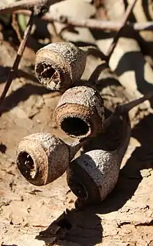 The dark red timber is hard and resistant to water,[10] and termites.[11] It has been used in railway sleepers and other general construction.[6] The woollybutt is also important in beekeeping and the honey industry.[10] It is useful as a shade tree or windbreak in paddocks, but grows too large for the average garden.[10]