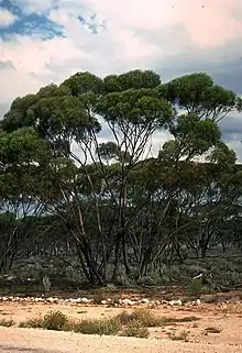 Eucalyptus melanoxylon, commonly known as black morrell,[2] is a species of small to medium-sized tree that is endemic to Western Australia. It has hard, fissured bark on some or all of its trunk, linear to narrow lance-shaped leaves, flower buds in groups of between seven and fifteen, white flowers and conical to cup-shaped fruit.