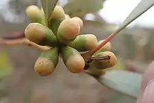 Eucalyptus micranthera, commonly known as the Alexander River mallee[2] or milkshake mallee,[3] is a species of mallee that is endemic to a small area along the south coast of Western Australia. It has smooth bark, lance-shaped adult leaves, flower buds in groups of seven or nine, creamy white flowers and more or less hemispherical fruit.