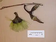 Eucalyptus newbeyi can be distinguished from the closely related Burdett gum (E. burdettiana) by its smooth, horn-shaped rather than warty operculum. It can also be distinguished from the warted yate (E. megacornuta) which has grossly warted bud caps and fruit that are bell shaped.[5]