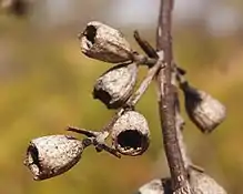 The mallee typically grows to a height of 1.5 to 5 metres (5 to 16 ft) and has smooth bark. It blooms between April and July producing inflorescences with white flowers.[2] It forms multiple stems each with a diameter of 5 to 10 centimetres (2.0 to 3.9 in)[4] from a lignotuber. The bark is usually smooth over the length of the trunk and branches and is grey to brown to coppery but sometimes white to cream to pink in colour sometimes with a short stocking of pale grey to yellowy-brown rough flaky bark.[5] The bark sheds from the tree in short ribbons or as small polygonal flakes.[6] The concolorous, glossy green adult leaves have an opposite to sub-opposite arrangement. The leaves are supported on petioles which are 0.5 to 1.7 centimetres (0.2 to 0.7 in) long. The leaf blade has a narrowly lanceolate to lanceolate shape and is 5.5 to 19.5 centimetres (2 to 8 in) in length and are 0.5 to 1.8 centimetres (0 to 1 in) wide with a base that tapers to the petiole.[5] The compound inflorescences are axillary or terminal with 0.2 to 0.5 centimetres (0.08 to 0.20 in) long terete peduncles with three buds per umbel. The buds have a clavate to pyriform shape and are 0.45 to 0.6 cm (0.18 to 0.24 in) in length and 0.4 to 0.6 cm (0.16 to 0.24 in) wide. When the sessile fruits form they are shortly pedicellate and have a cylindrical to barrel-shaped to cup-shaped to obconical shape with a length of 0.7 to 1.4 cm (0.28 to 0.55 in) and a width of 0.5 to 0.7 cm (0.20 to 0.28 in). The fruits have a vertically descending disc with three or four enclosed valves. They contain flattened dull grey seeds and are 4 to 6 millimetres (0.16 to 0.24 in) long.[5][7]