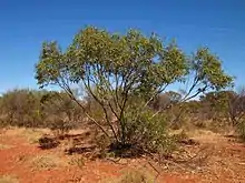 In the Northern Territory the species forms part of the upper shrub layer in mixed woodland communities on sandplains often found with Corymbia opaca, Hakea macrocarpa and Atalaya hemiglauca in the overstorey with Acacia coriacea and Streptoglossa odora in the shrub layer with a ground layer beneath including grasses such as Triodia pungens, Aristida holathera, Aristida contorta and Astrebla pectinata.[10] In the Pilbara of Western Australia it is found in low tree woodlands with Corymbia hamersleyana over Acacia tumida var. pilbarensis shrubland with Templetonia hookeri and Acacia adoxa over Triodia epactia hummock grasses.[11]