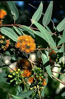 The tree typically grows to a height of 4 to 12 metres (13 to 39 ft)[3] and is mostly single-stemmed but has a lignotuber. The bark of the tree is soft, fibrous, flaky and rough bark over the majority of the trunk and larger branches. The rougher bark is a yellow-grey to orange-brown colour while the bark on large branches is sometimes white to pinkish-grey coloured smooth bark. The alternately arranged adult leaves are concolorous to slightly discolorous and a dull green to grey-green colour. The leaf blade has a lanceolate shape with a length of 6.5 to 14 centimetres (2.6 to 5.5 in) and a width of 0.9 to 4.5 cm (0.35 to 1.77 in) and the base tapers to the petiole.[4] The tree usually blooms between February or March and September or November producing orange flowers.[3][4] The single axillary inflorescences form groups of over seven buds per umbel. The bright green mature buds have a clavate to pyriform shape with a length of 0.8 to 1.9 cm (0.31 to 0.75 in) and a width of 0.5 to 0.8 cm (0.20 to 0.31 in) with bright orange flowers. The woody pedicellate fruits have a cylindrical and urceolate shape and are slightly longitudinally ribbed. The fruits are 1.9 to 3 cm (0.75 to 1.18 in) in length and about half as wide with a vertically descending disc and two enclosed valves. The dull dark grey to black seeds within have a saucer shape and are 3 to 5 mm (0.118 to 0.197 in) long.[4]