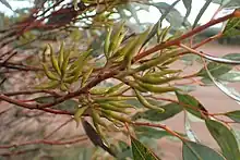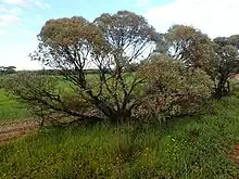 • Eucalyptus pluricaulis Brooker & Hopper subsp. pluricaulis[8][9] is an erect mallee with bluish green leaves and up to eleven buds in each group;[5]