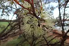 • Eucalyptus pluricaulis subsp. prophyrea Brooker & Hopper[10][11] is a low, straggly mallee with purplish leaves and up to fifteen flowers in each group.[5]