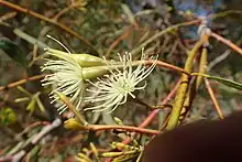 Eucalyptus sargentii, commonly known as Salt River gum,[2] is a species of mallet, mallee or small tree that is endemic to Western Australia. It has rough bark on part or all of the trunk, smooth bark above, linear to narrow lance-shaped leaves, flower buds in groups of seven, whitish to creamy yellow flowers and conical fruit.