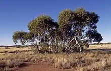 Eucalyptus sparsa, commonly known as the northern ranges box,[2] is a species of mallee that is endemic to inland Australia, near the border between the Northern Territory, South Australia and Western Australia border. It has smooth pale grey and brown bark, often with rough bark on the base of larger trunks, lance-shaped adult leaves, flower buds usually in groups of seven, white flowers and shortened spherical to conical fruit.