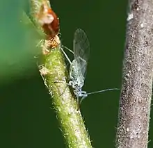 The silver birch aphid is a light green colour with a bluish tinge. The blueness is due to the dusting of blue wax particles which are particularly obvious on the antennae and legs. All adults have membranous wings and during the spring and summer, all individuals are female.[1] The mouthparts are specialised to form a slender stylet for piercing and sucking sap from their host tree.
